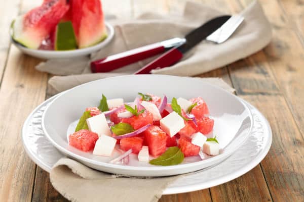 Ingredients: 6 cups cubed watermelon 1/2 red onion, chopped 1/2 cup feta cheese 1/3 cup fresh mint leaves, ...